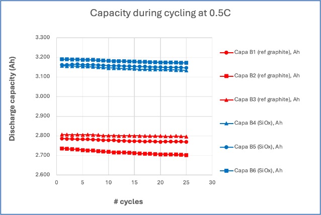 As shown, the three batteries utilizing Novacium’s custom-engineered SiOx blend demonstrated a high discharge capacity of approximately 3.18 Ampere-hours (Ah), outperforming the benchmark set by three comparison batteries with a capacity of 2.70 Ah over 25 cycles. This represents a 14% enhancement in the full-battery capacity of industrial-type batteries when compared to those with a 100% graphite anode, marking a significant milestone within the initial 25 cycles.