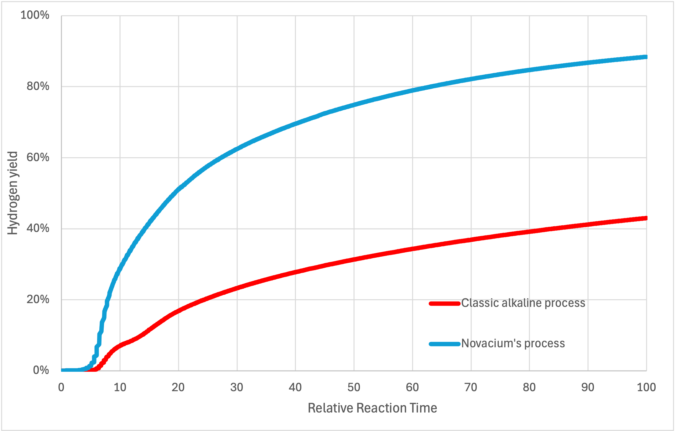 As Figure 2 above indicates, compared to the traditional black aluminum dross treatment process, (Dross A + NaOH) which relies on sodium or potassium hydroxide as additives to accelerate hydrolysis, Novacium’s method (Dross A + Additive) demonstrates a significantly higher hydrogen yield. Multiples tests conducted using various dross samples from industrial partners revealed that Novacium’s process more than doubles hydrogen production compared to the conventional alkaline approach.