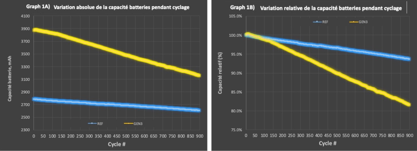 and GEN3 batteries (the yellow line), over 900 cycles [1]. Additionally, Graph 1B highlights the relative capacity variation for the same batteries used in Graph 1A.